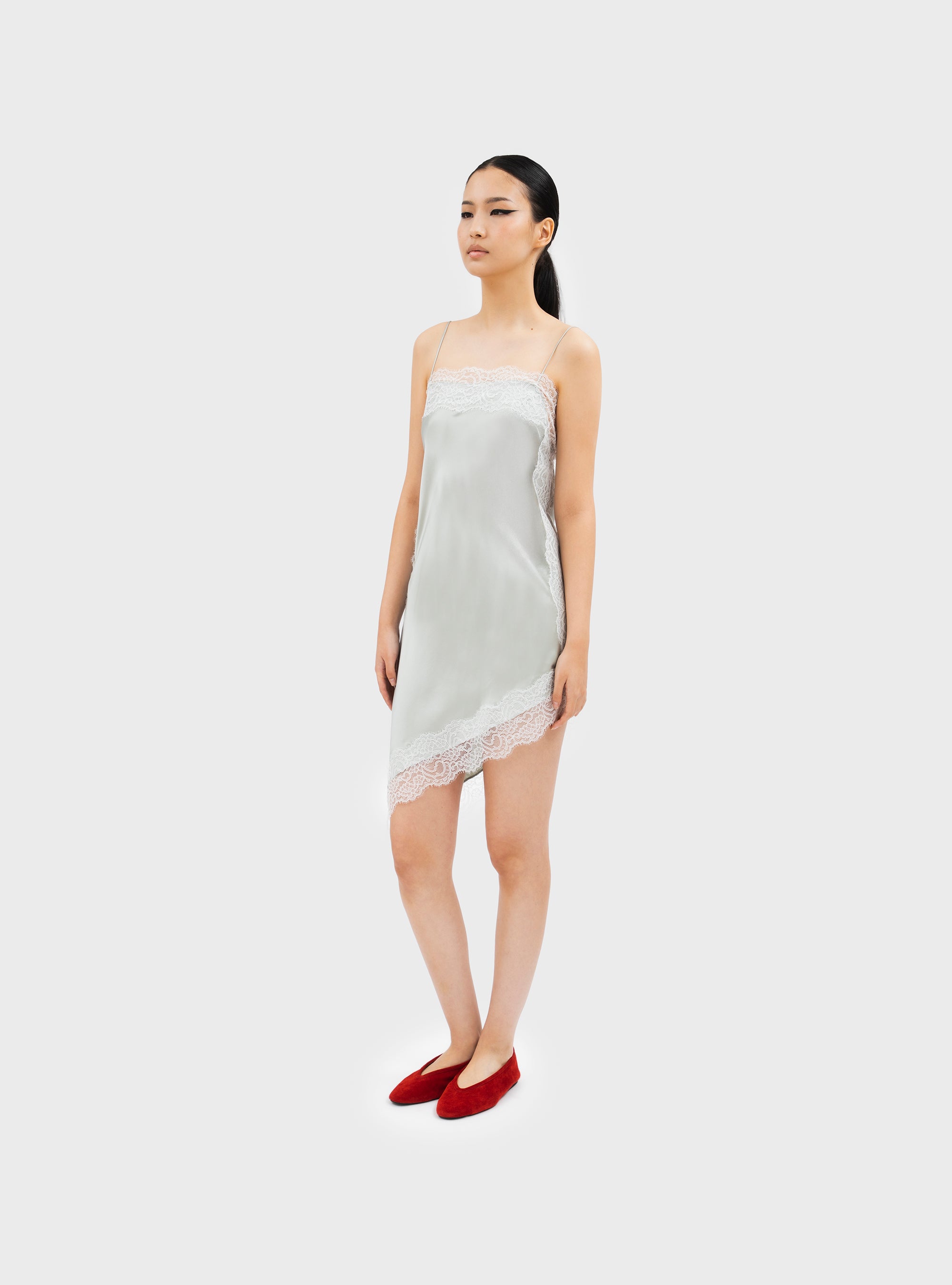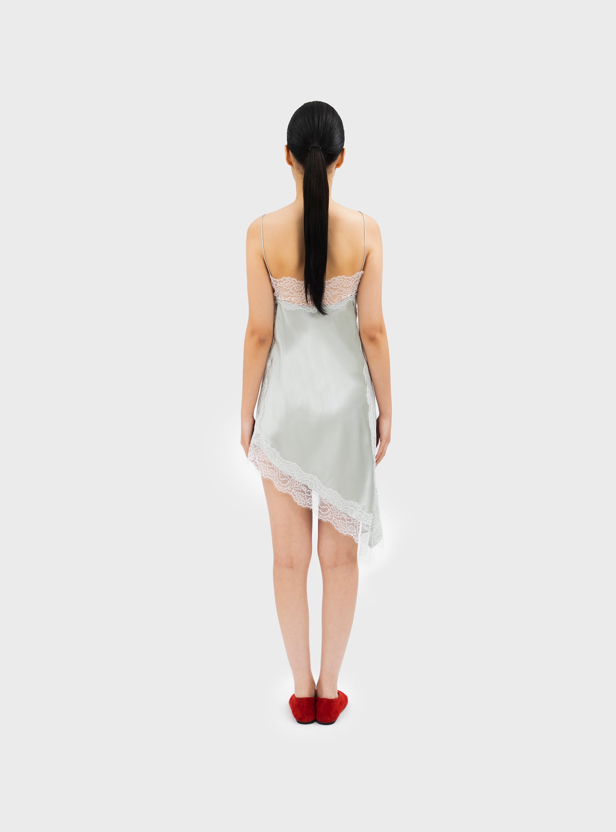 Asymmetric knee-length slip dress in pure silk. With contrasting lace trim. Featuring a straight neckline and thin straps. The pure silk gives the garment a fluid fit and a soft feel.