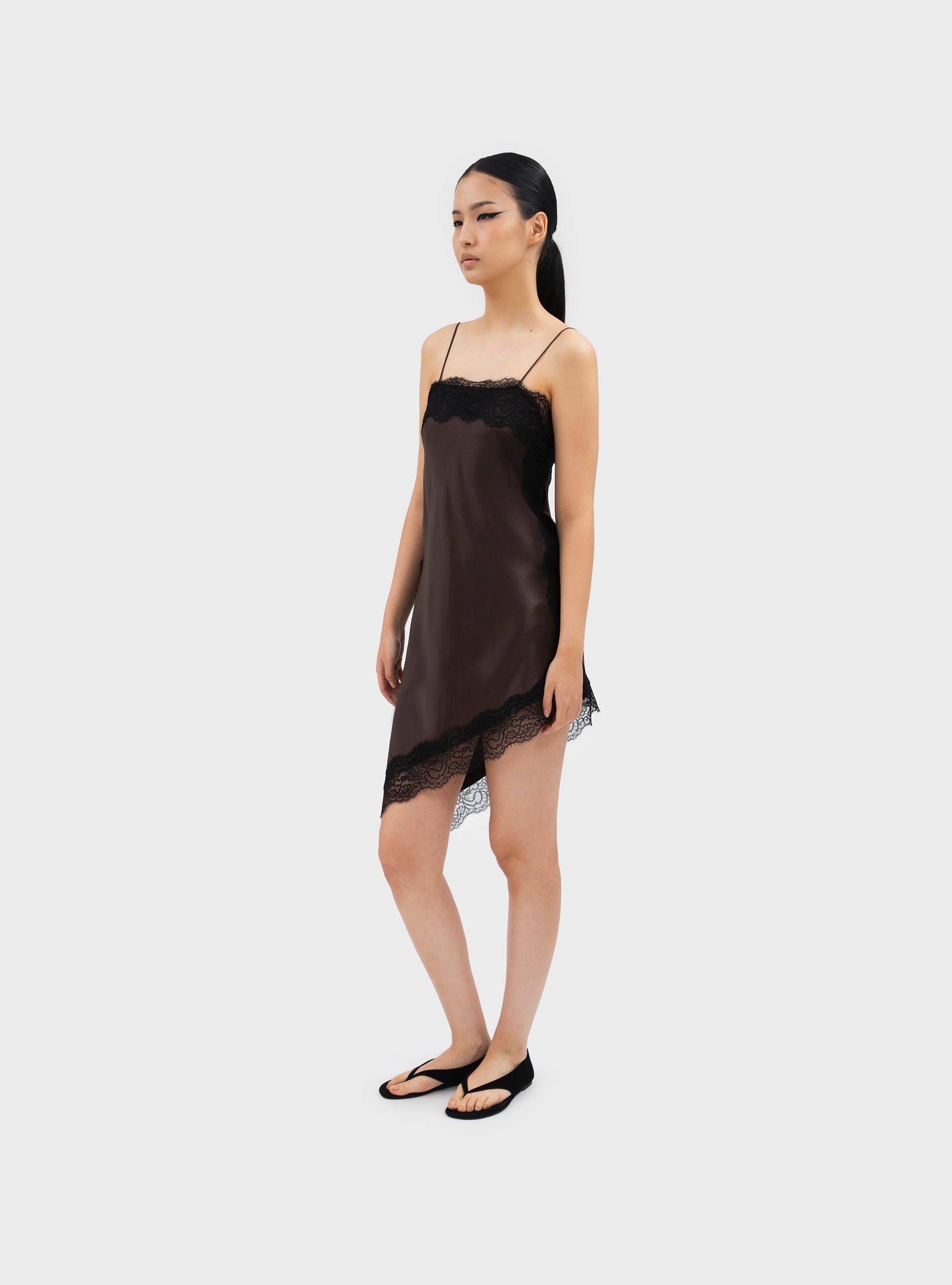 Asymmetrical knee-length slip dress in pure silk. With contrasting lace trim. Featuring a straight neckline and thin straps. Pure silk gives the garment a flowing fit and a soft feel.
