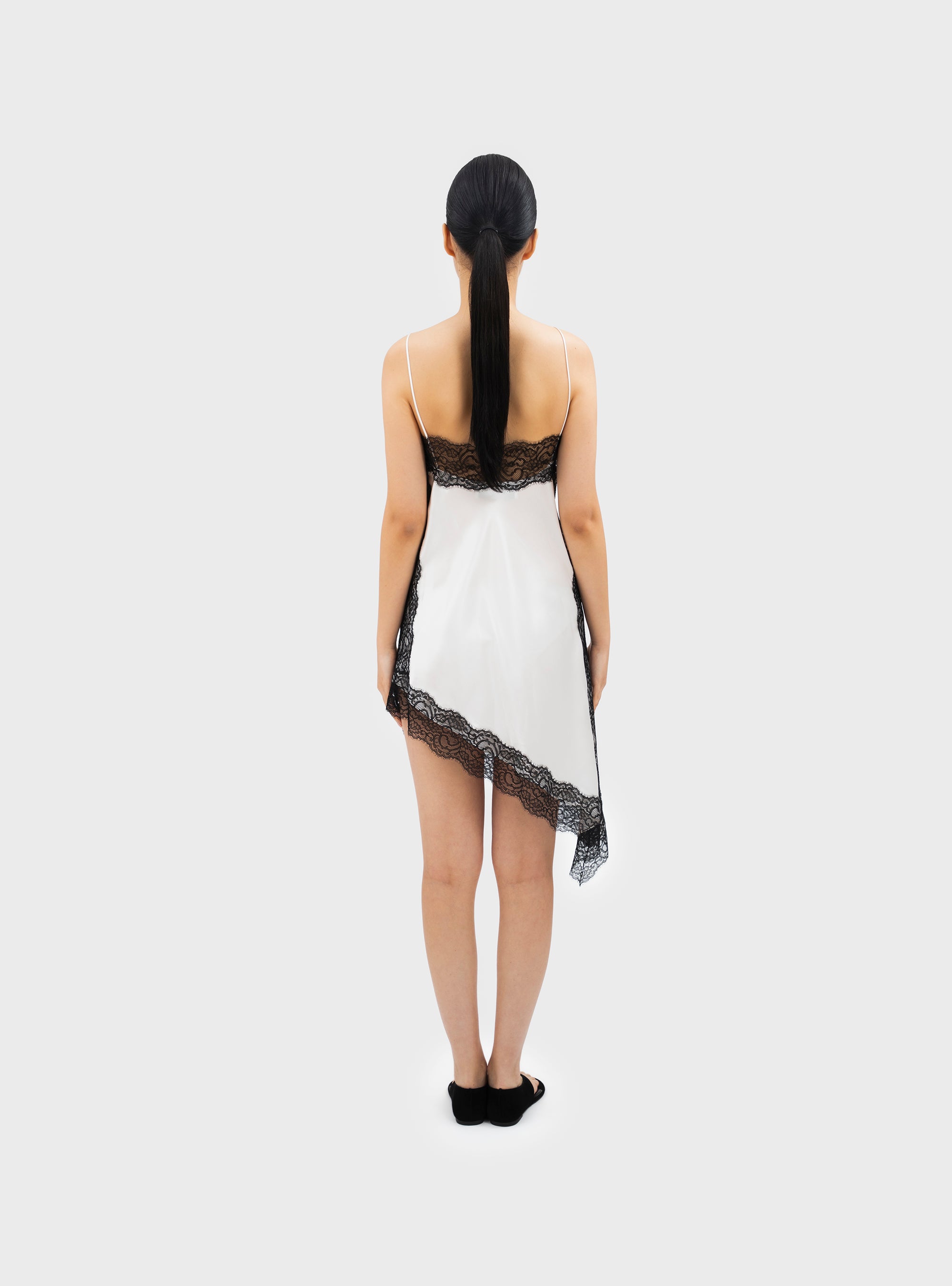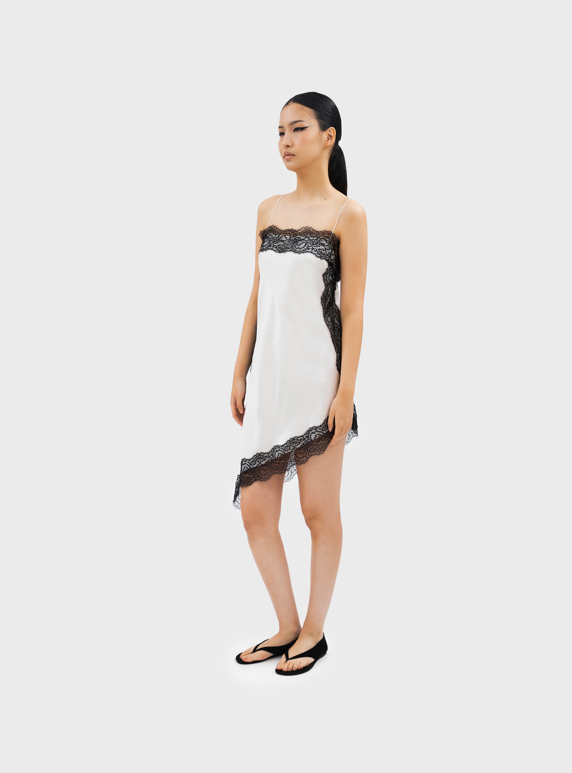 Asymmetric knee-length slip dress in pure silk. With contrasting lace trim. Featuring a straight neckline and thin straps. The pure silk gives the garment a flowing fit and a soft feel.