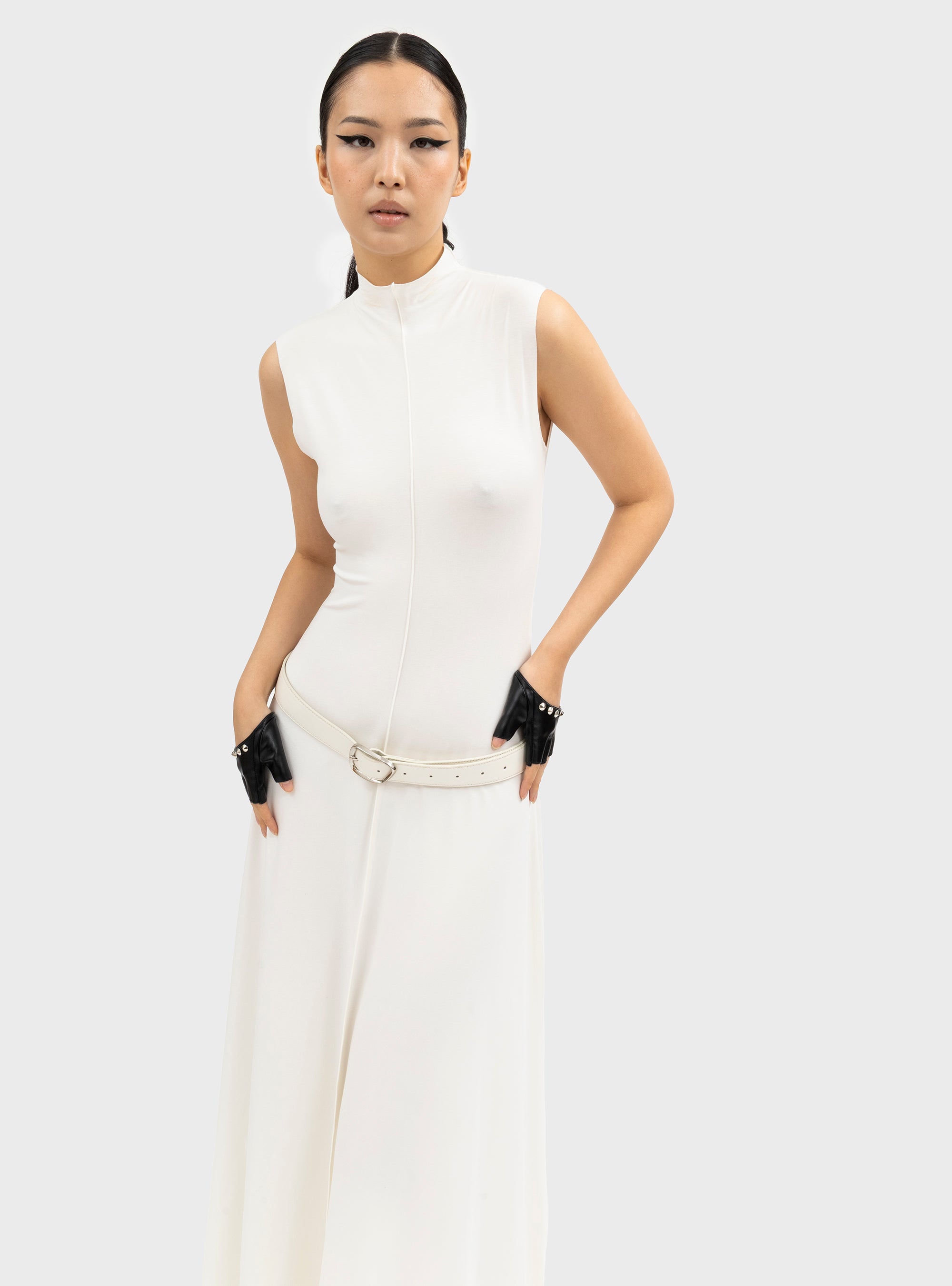 Cintura in pelle di vitello latte. Con logo embossed. Lunghezza 125 cm.