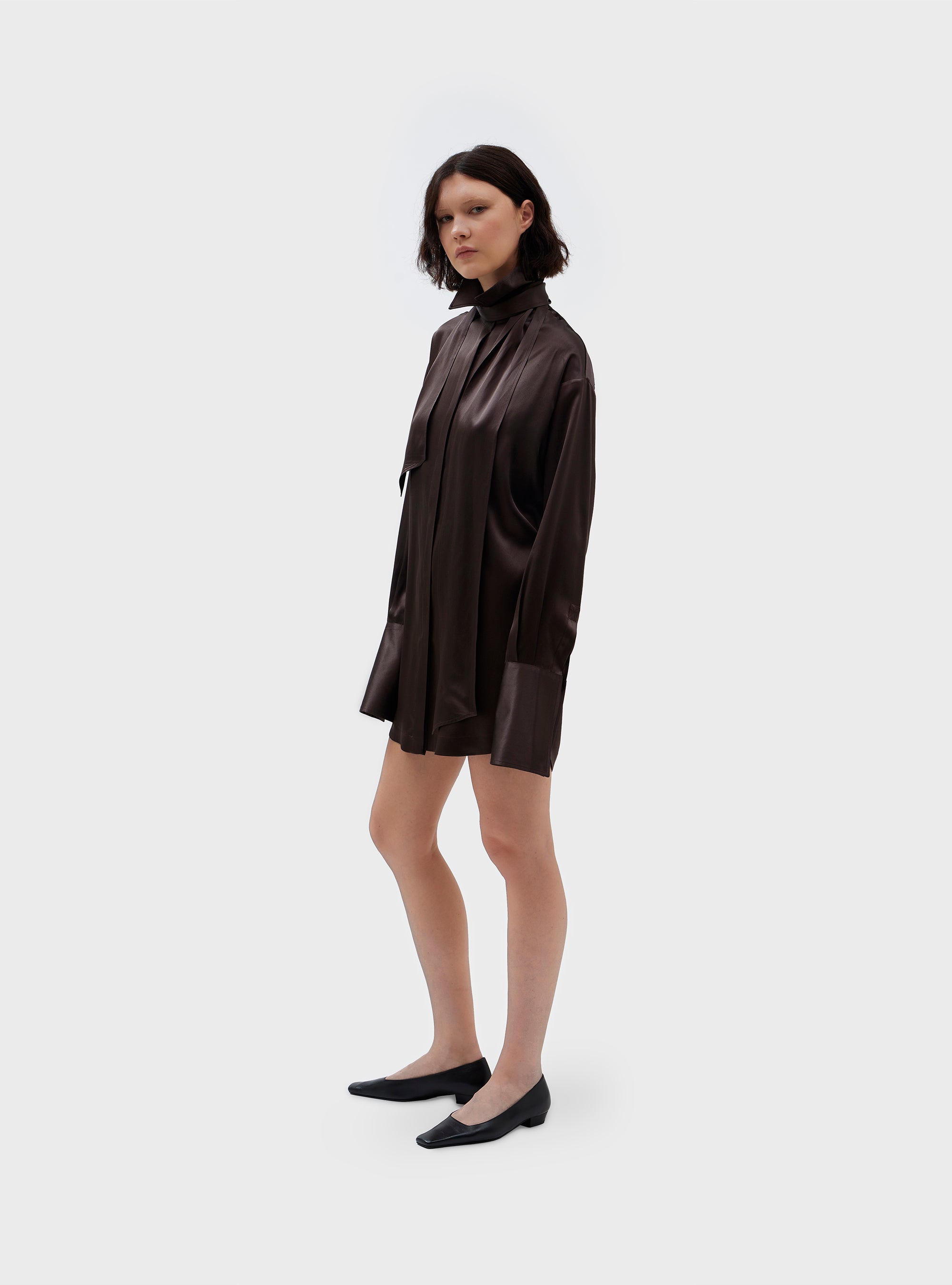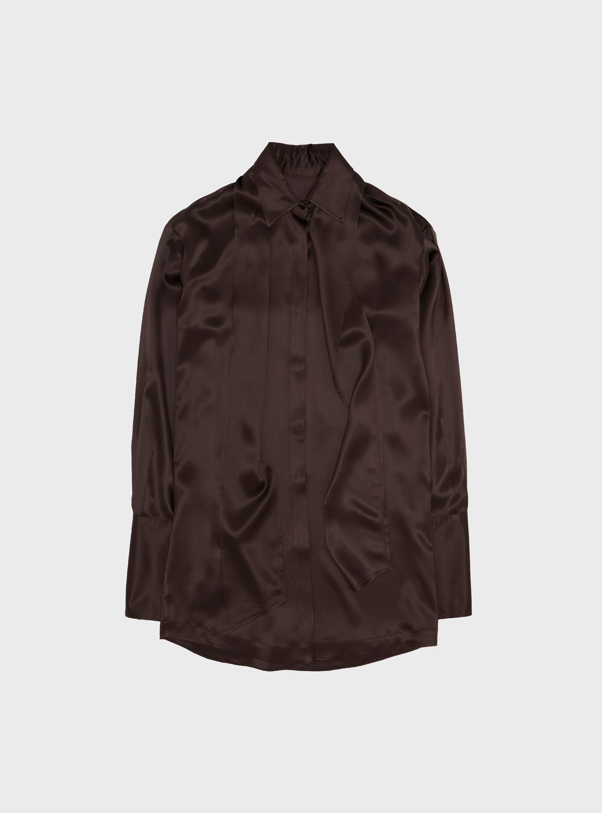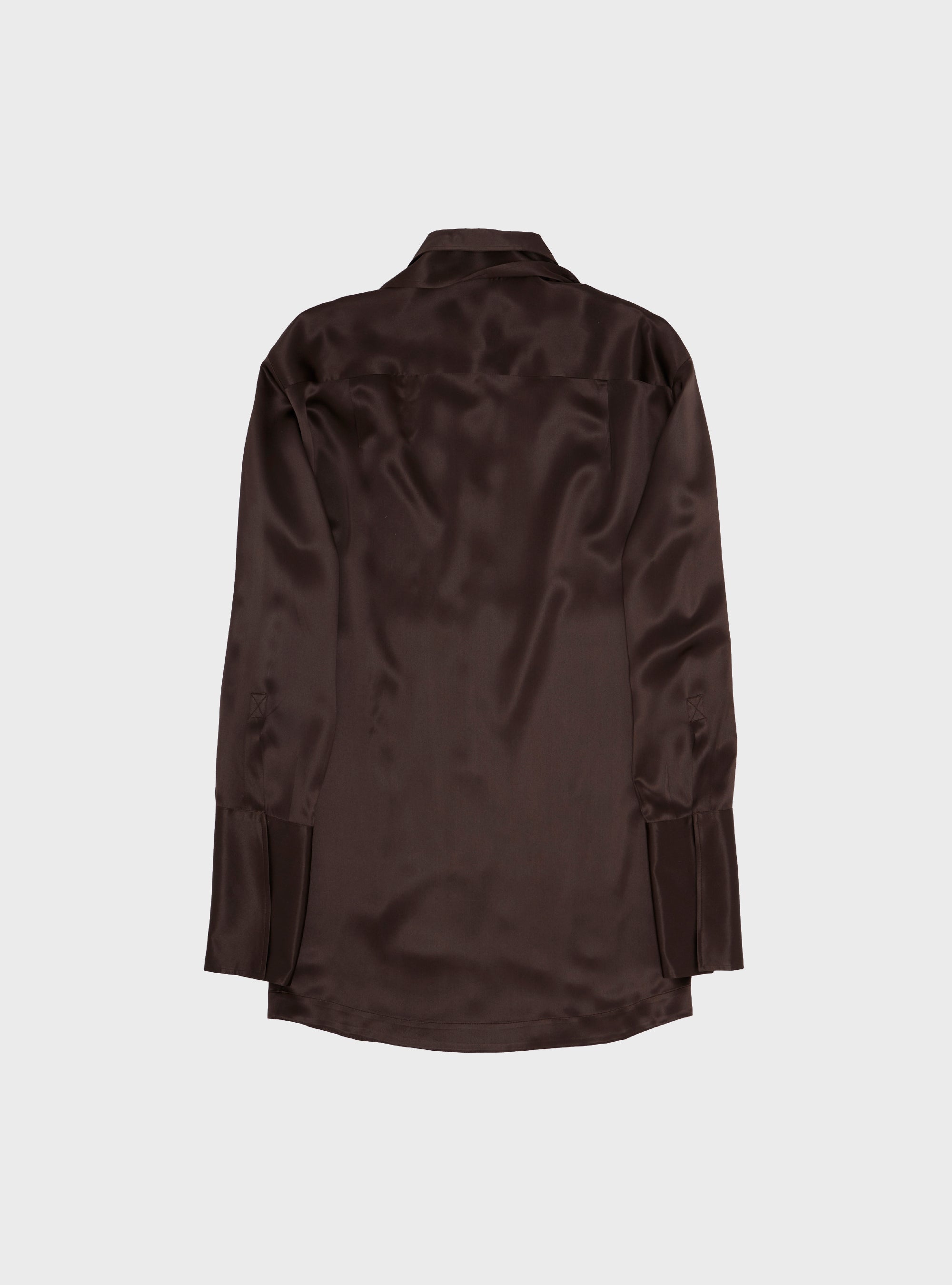 Abito camicia in pura seta. Volume morbido. Ispirato ad una camicia smoking maschile, con doppio polsino e chiusura con bottone gioiello, che ricorda la chiusura con gemelli. Colletto camicia con foulard, fissato sulla parte dietro del collo. Abbottonatura nascosta. La pura seta dona al capo una vestibilità fluida e una mano morbida.