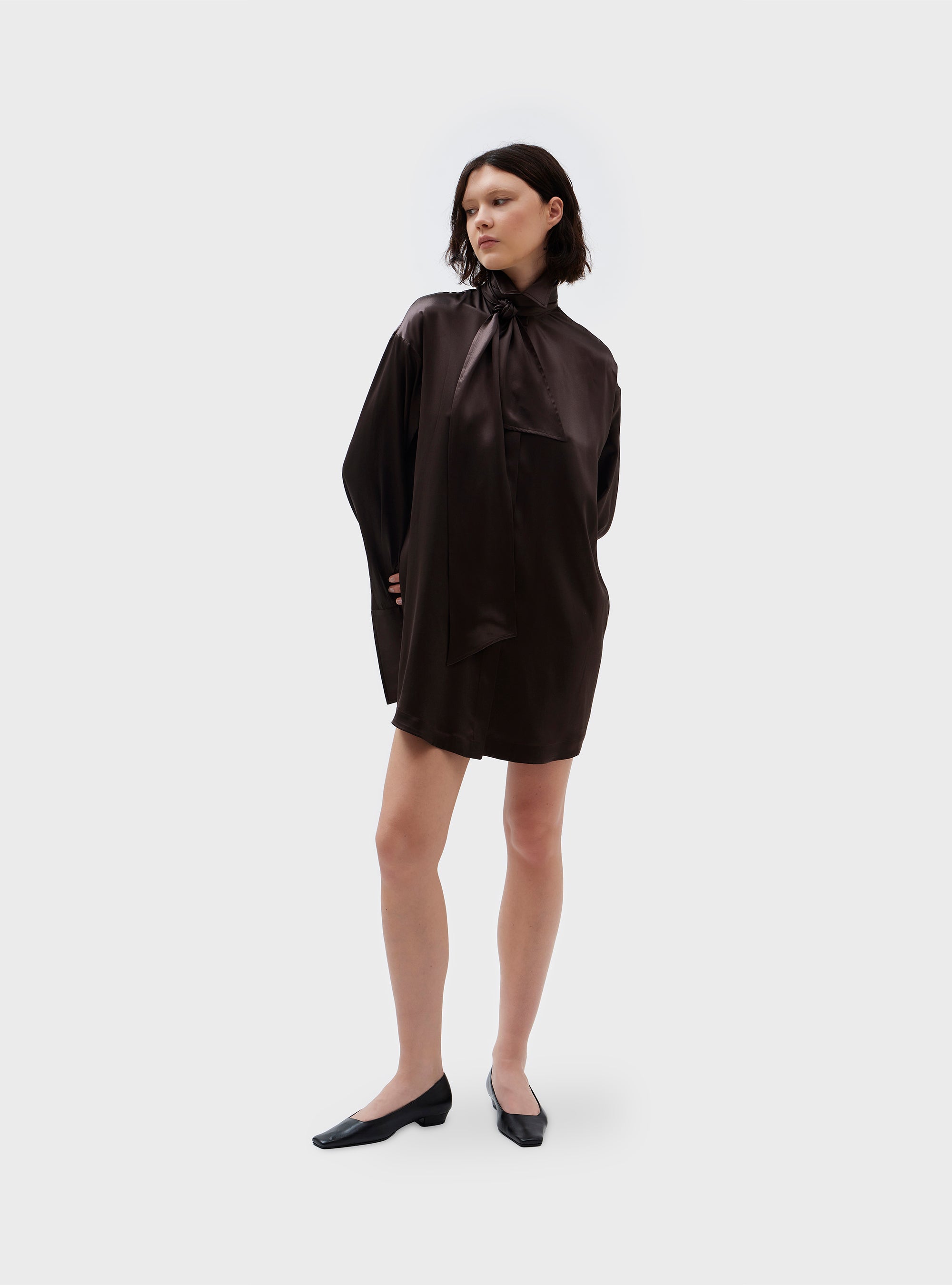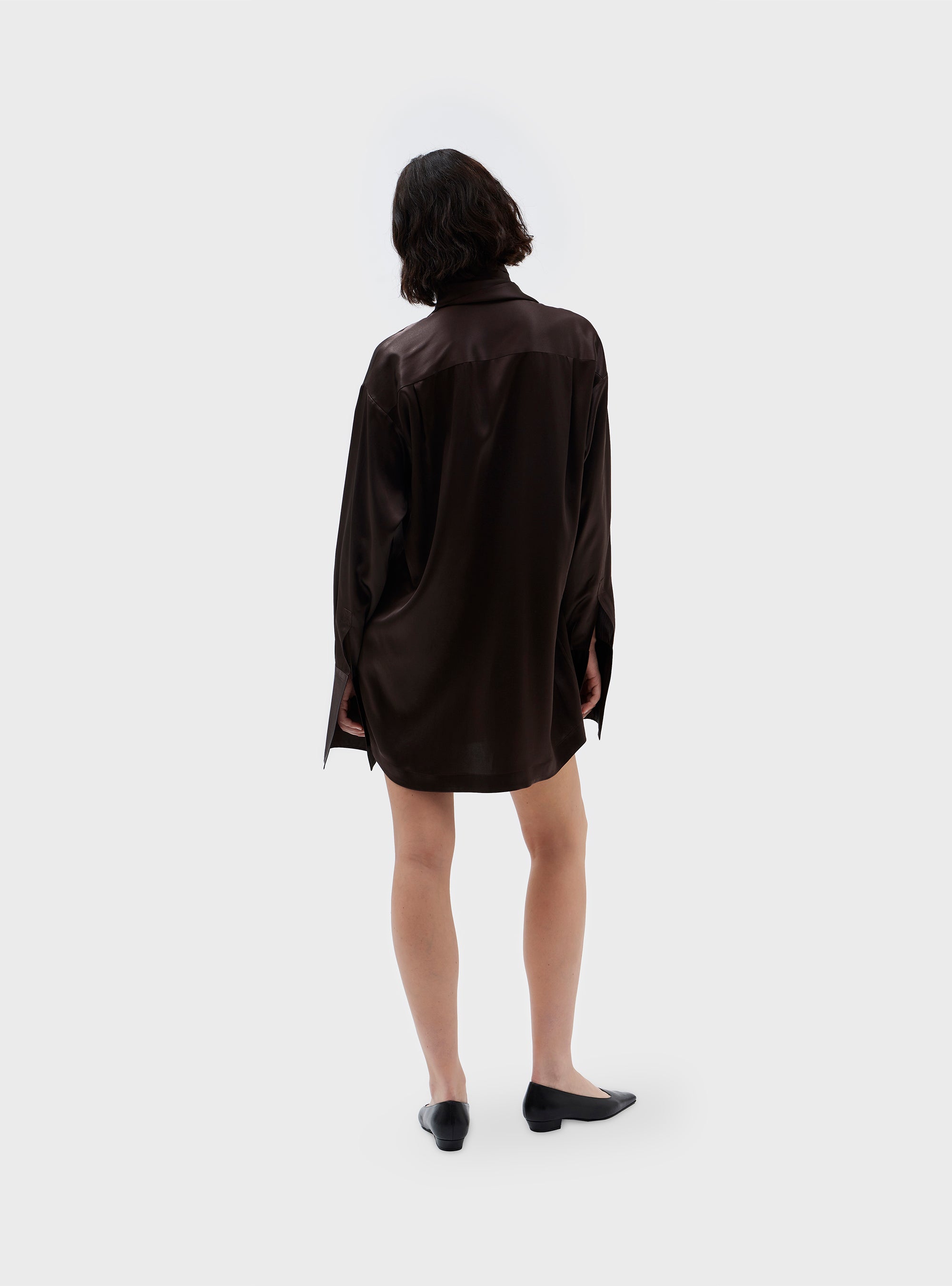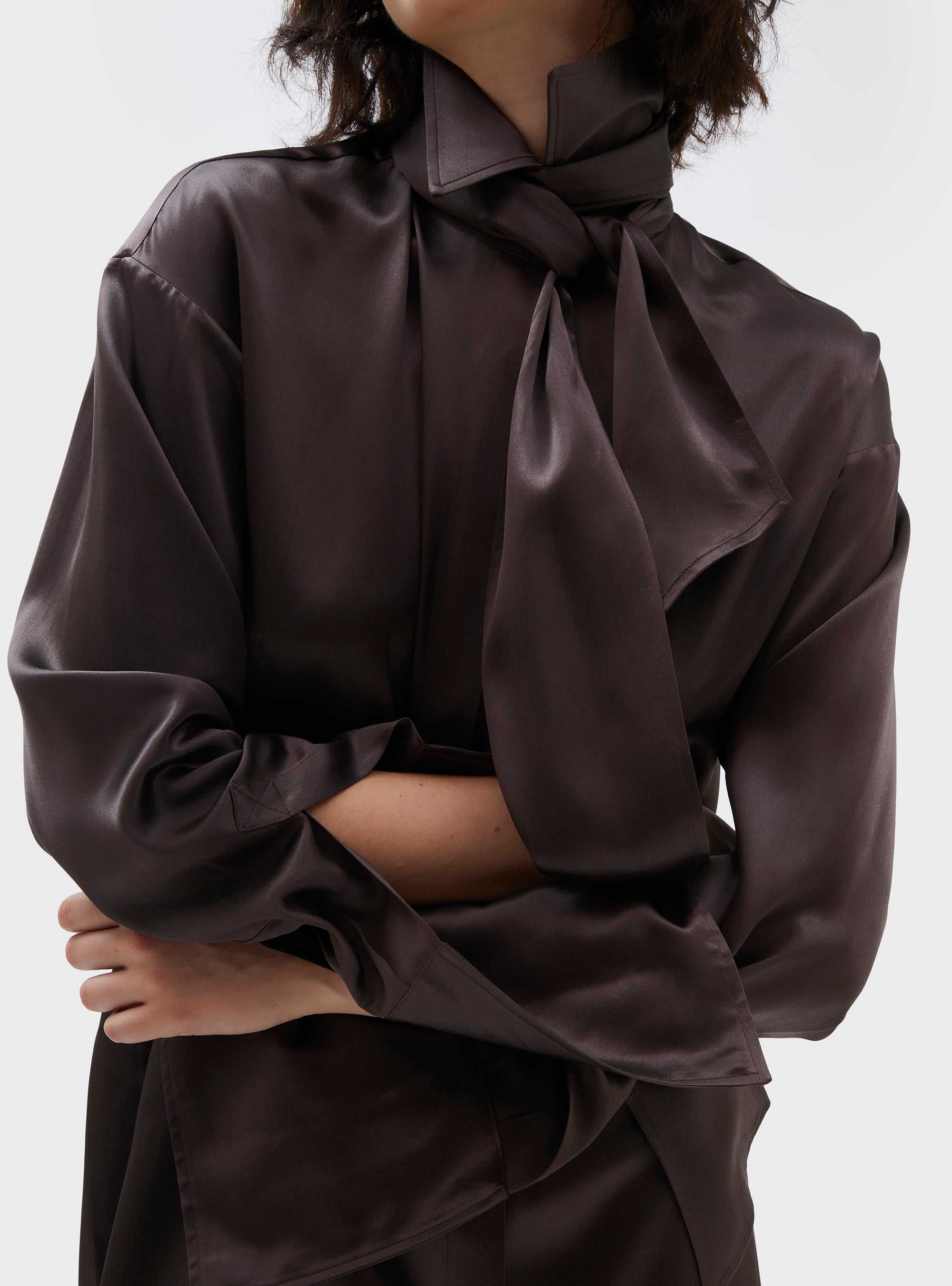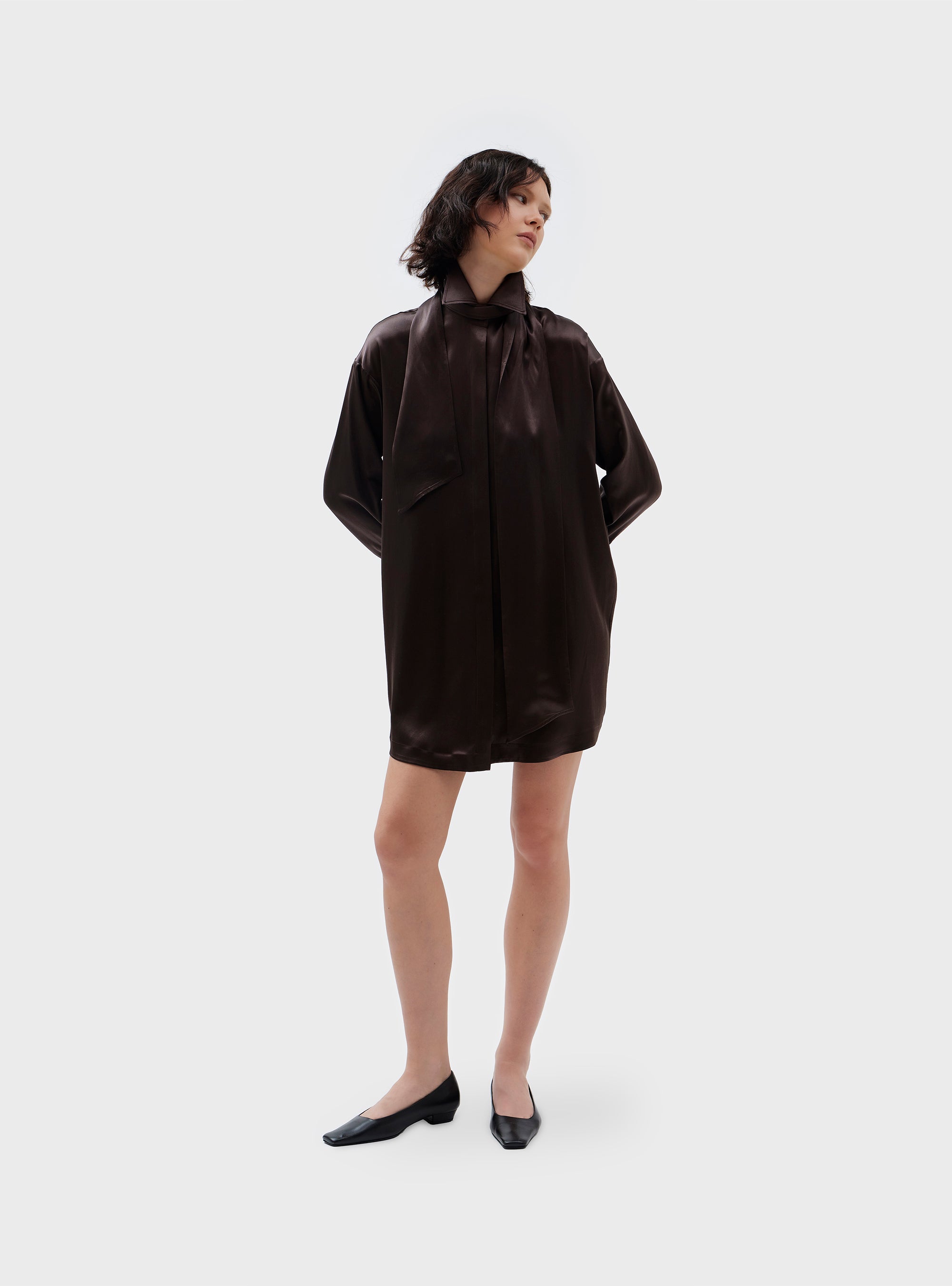 Abito camicia in pura seta. Volume morbido. Ispirato ad una camicia smoking maschile, con doppio polsino e chiusura con bottone gioiello, che ricorda la chiusura con gemelli. Colletto camicia con foulard, fissato sulla parte dietro del collo. Abbottonatura nascosta. La pura seta dona al capo una vestibilità fluida e una mano morbida.