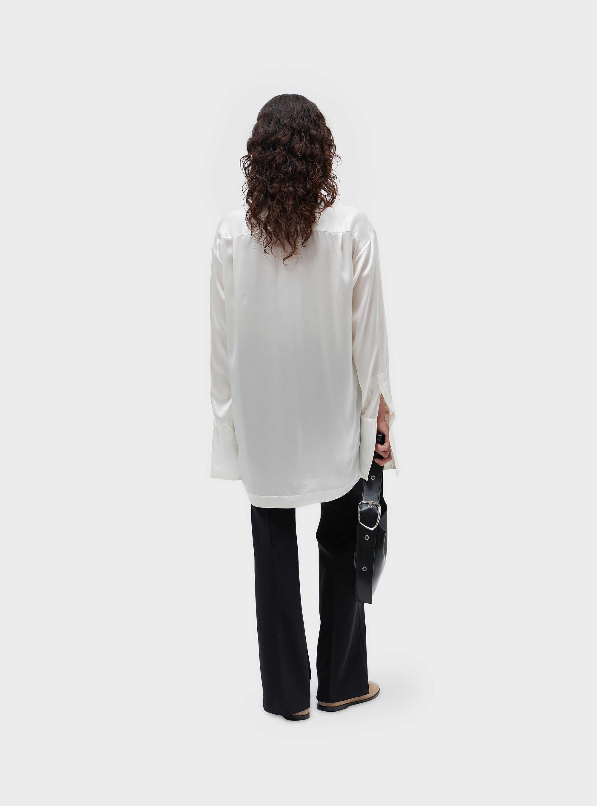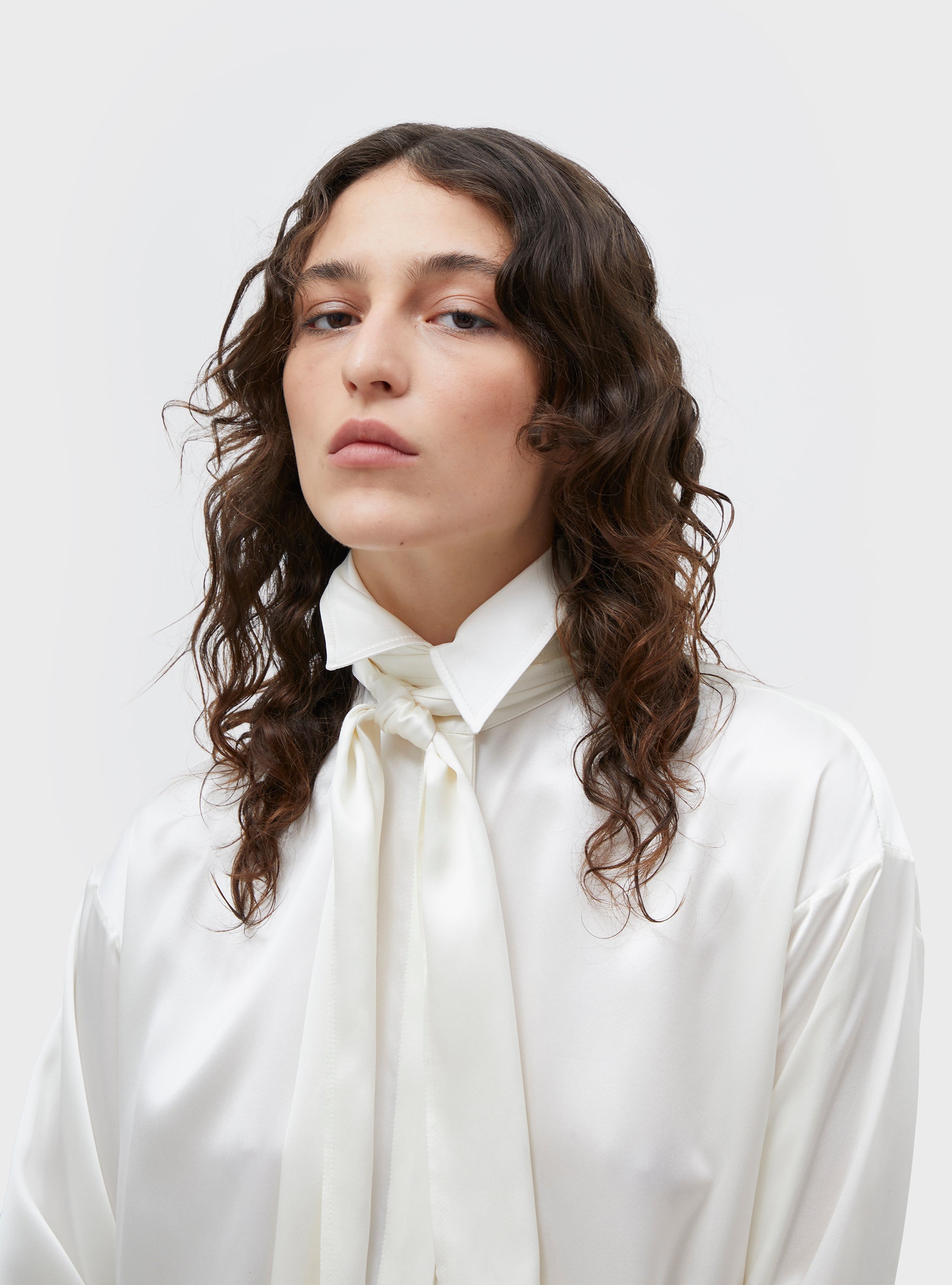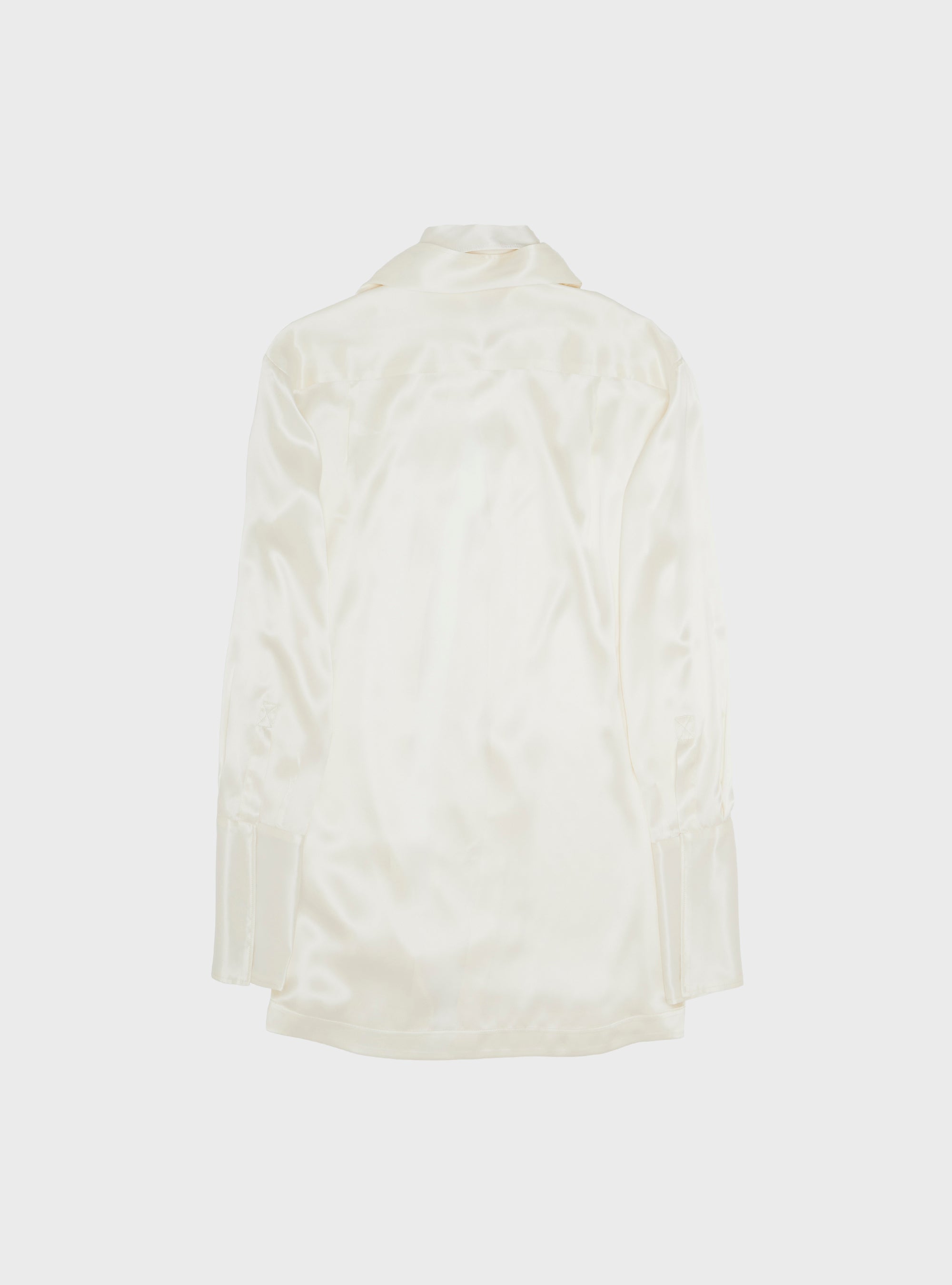 Abito camicia in pura seta. Volume morbido. Ispirato ad una camicia smoking maschile, con doppio polsino e chiusura con bottone gioiello, che ricorda la chiusura con gemelli. Colletto camicia con foulard, fissato sulla parte dietro del collo. Abbottonatura nascosta. La pura seta dona al capo una vestibilità fluida e una mano morbida.