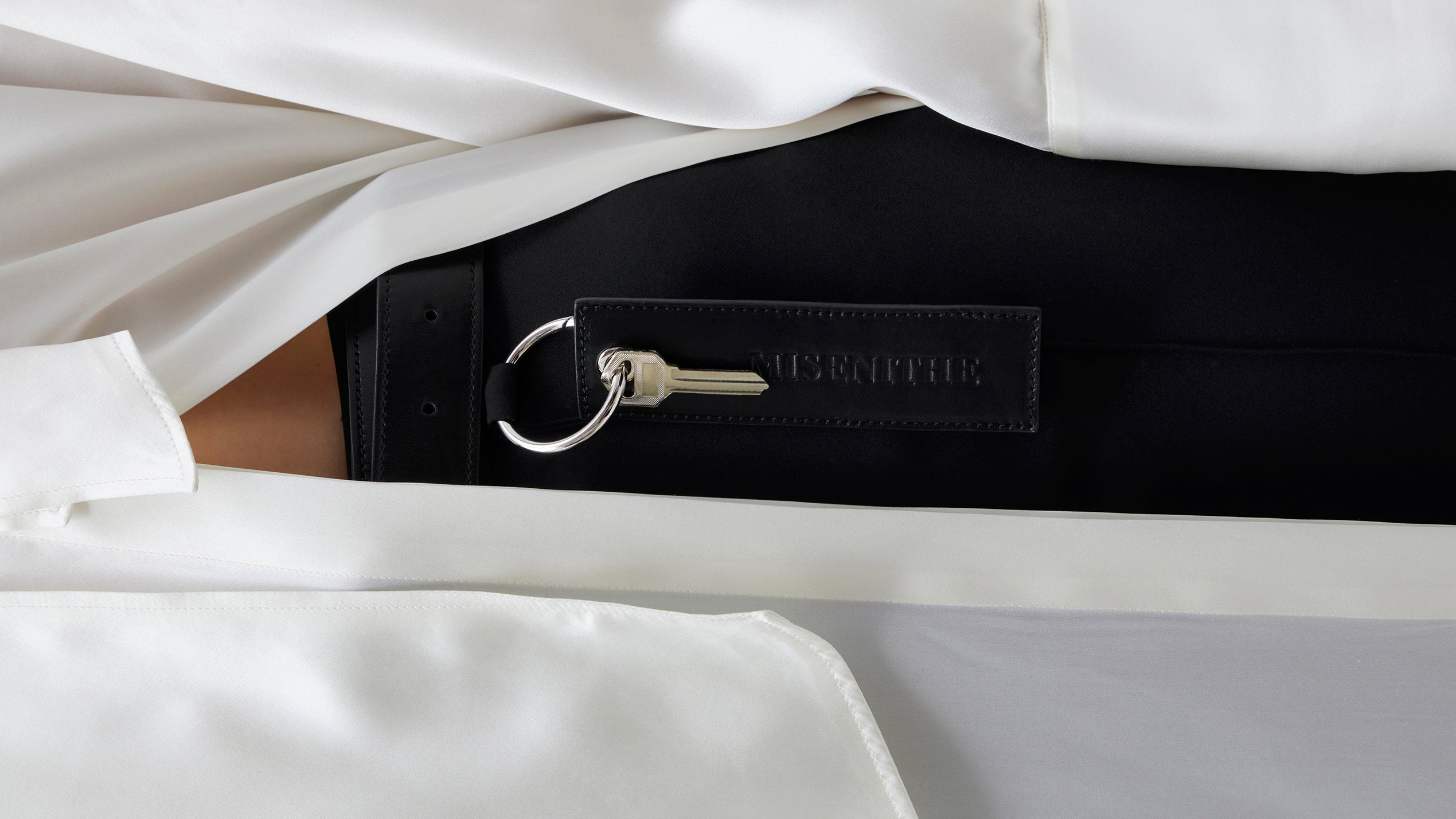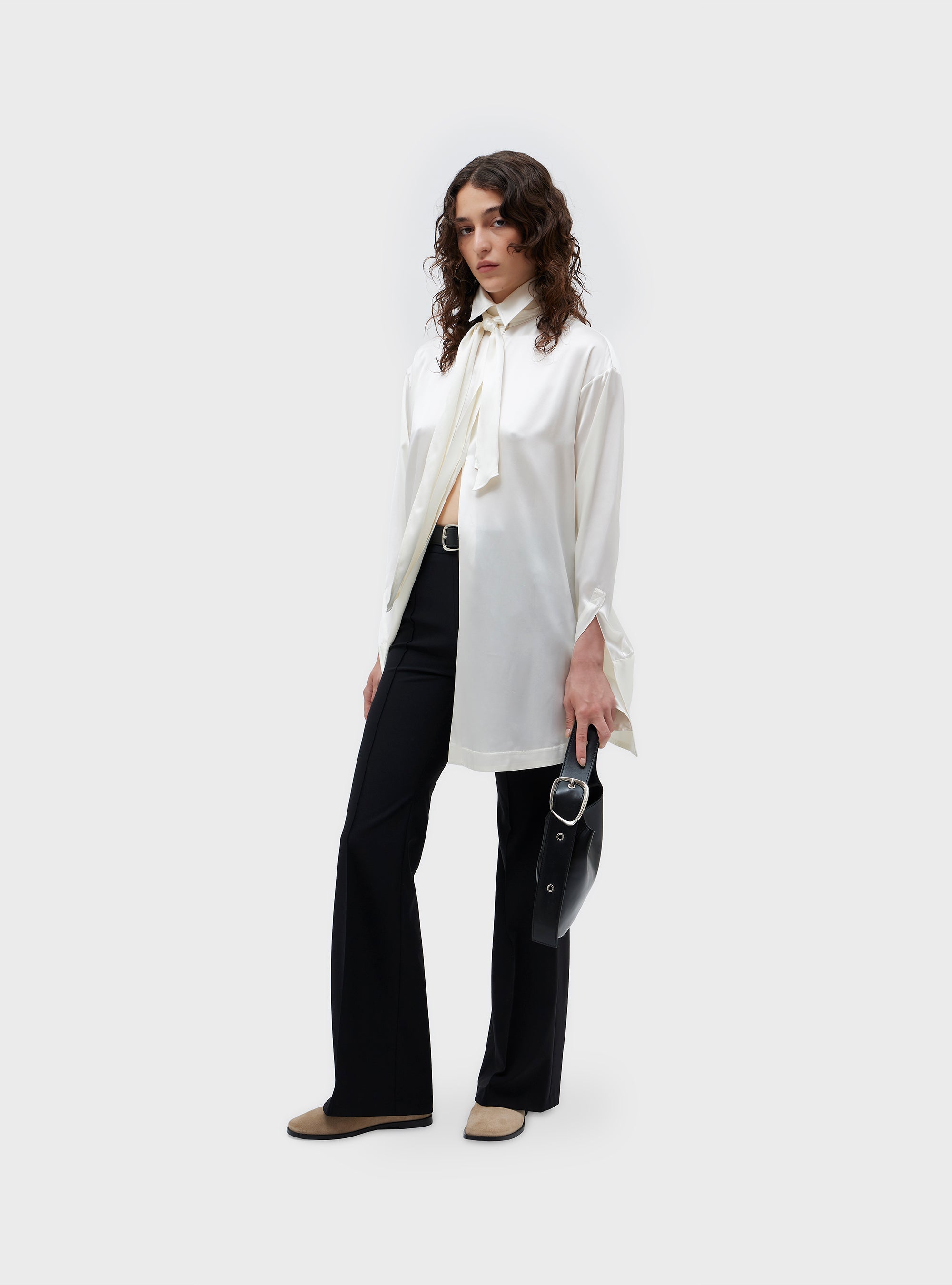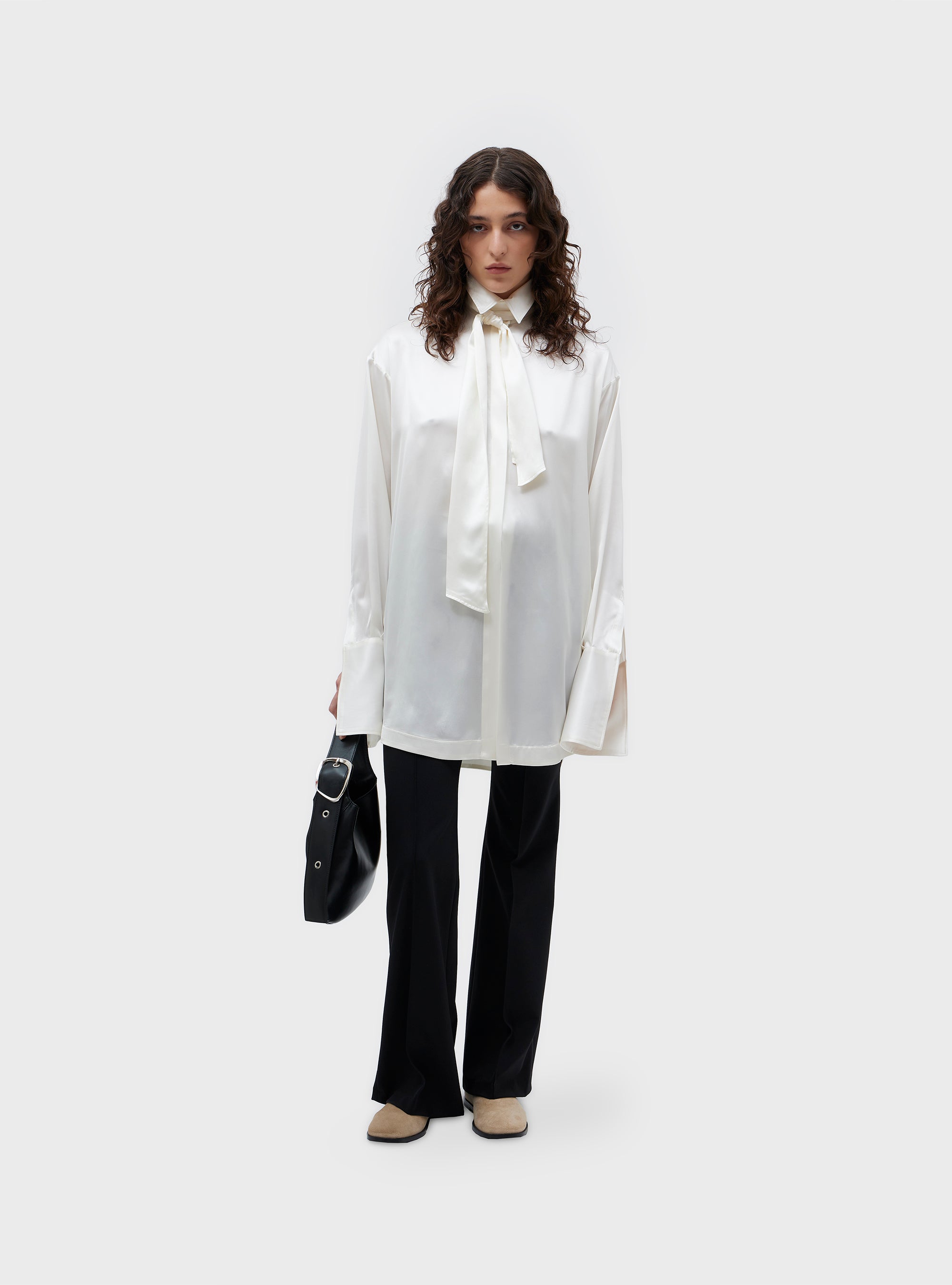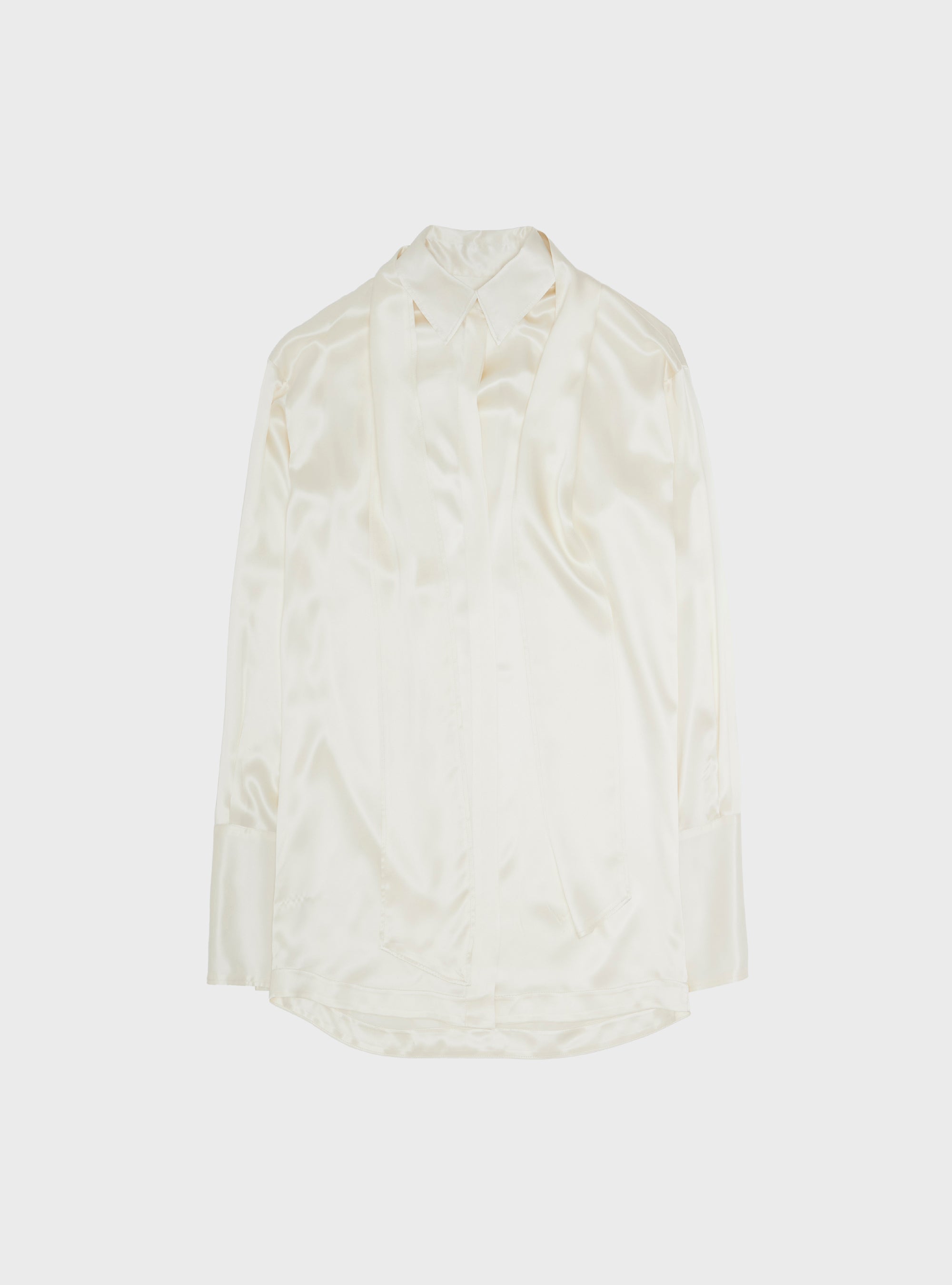 Abito camicia in pura seta. Volume morbido. Ispirato ad una camicia smoking maschile, con doppio polsino e chiusura con bottone gioiello, che ricorda la chiusura con gemelli. Colletto camicia con foulard, fissato sulla parte dietro del collo. Abbottonatura nascosta. La pura seta dona al capo una vestibilità fluida e una mano morbida.