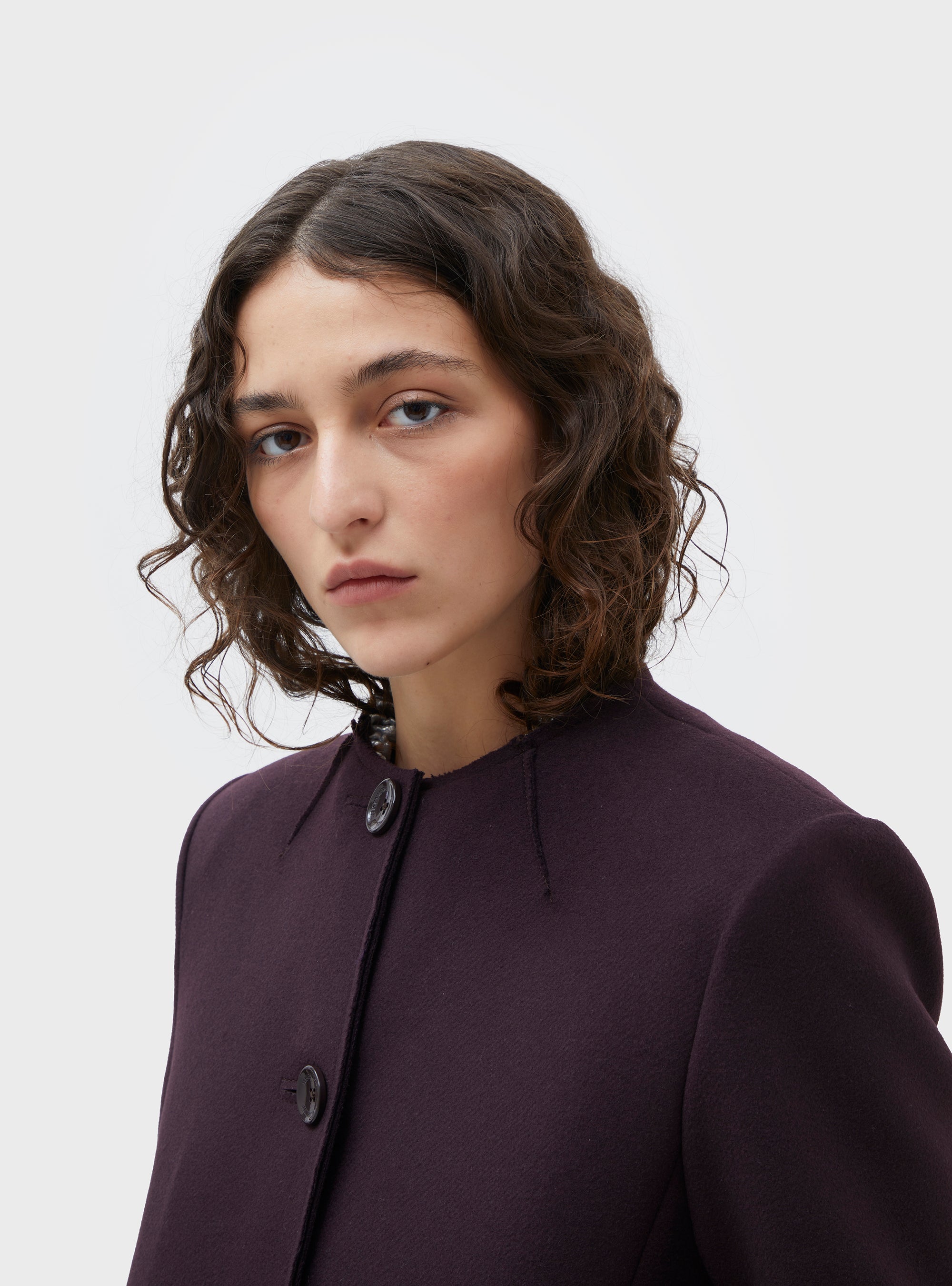 Cappotto taglio sartoriale in lana. Con spalla leggermente strutturata e girovita sagomato. Il cappotto è sfoderato. Tagliato a vivo con impunture visibili. Tasche patch sul davanti, e tasca interna. Il misto lana ha una texture sottile, compatta e confortevole.