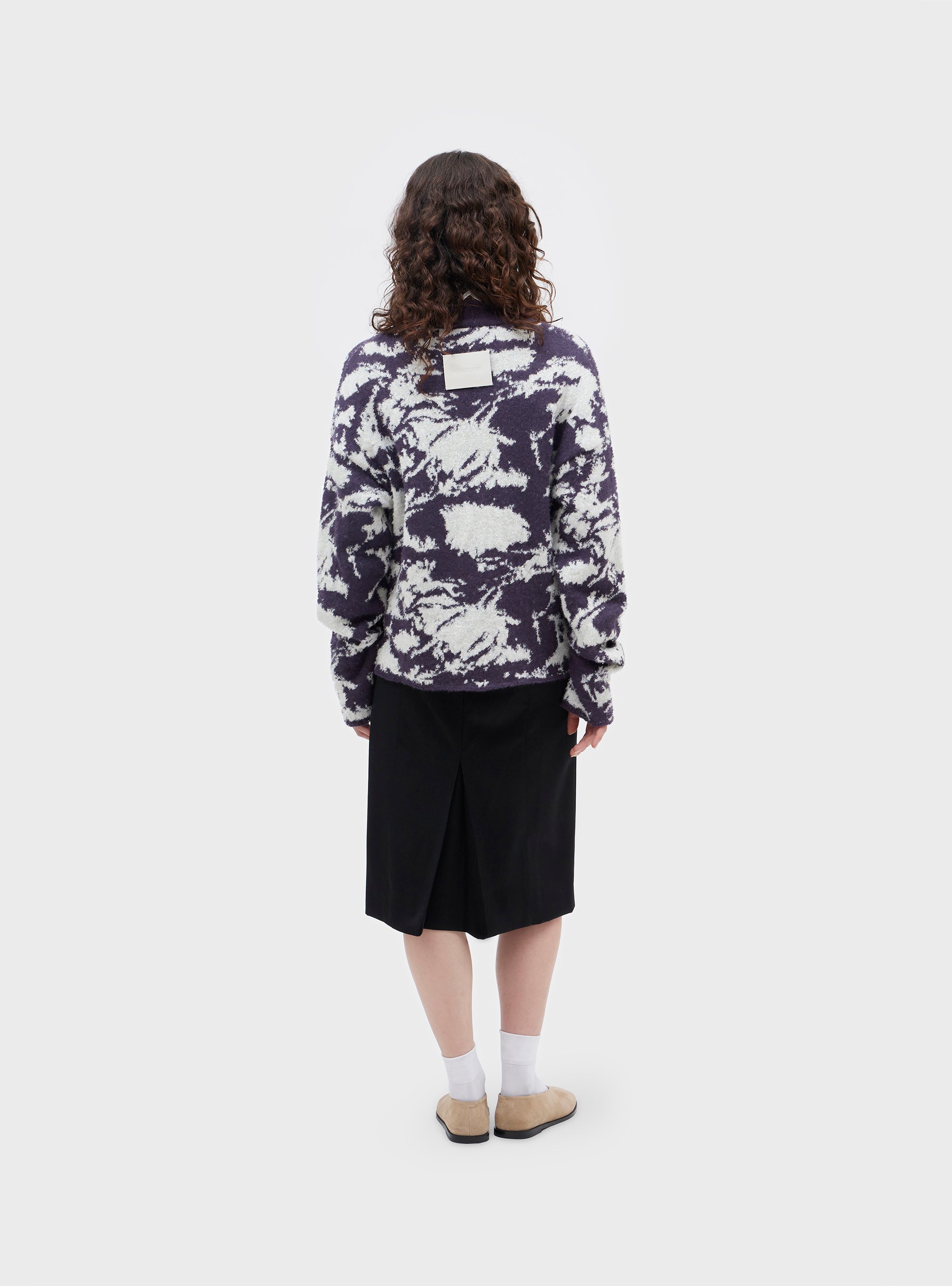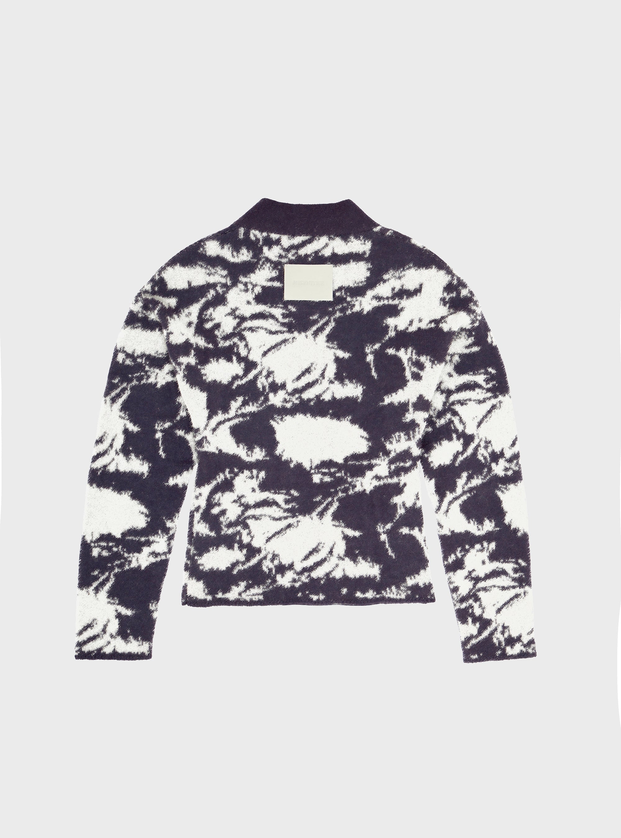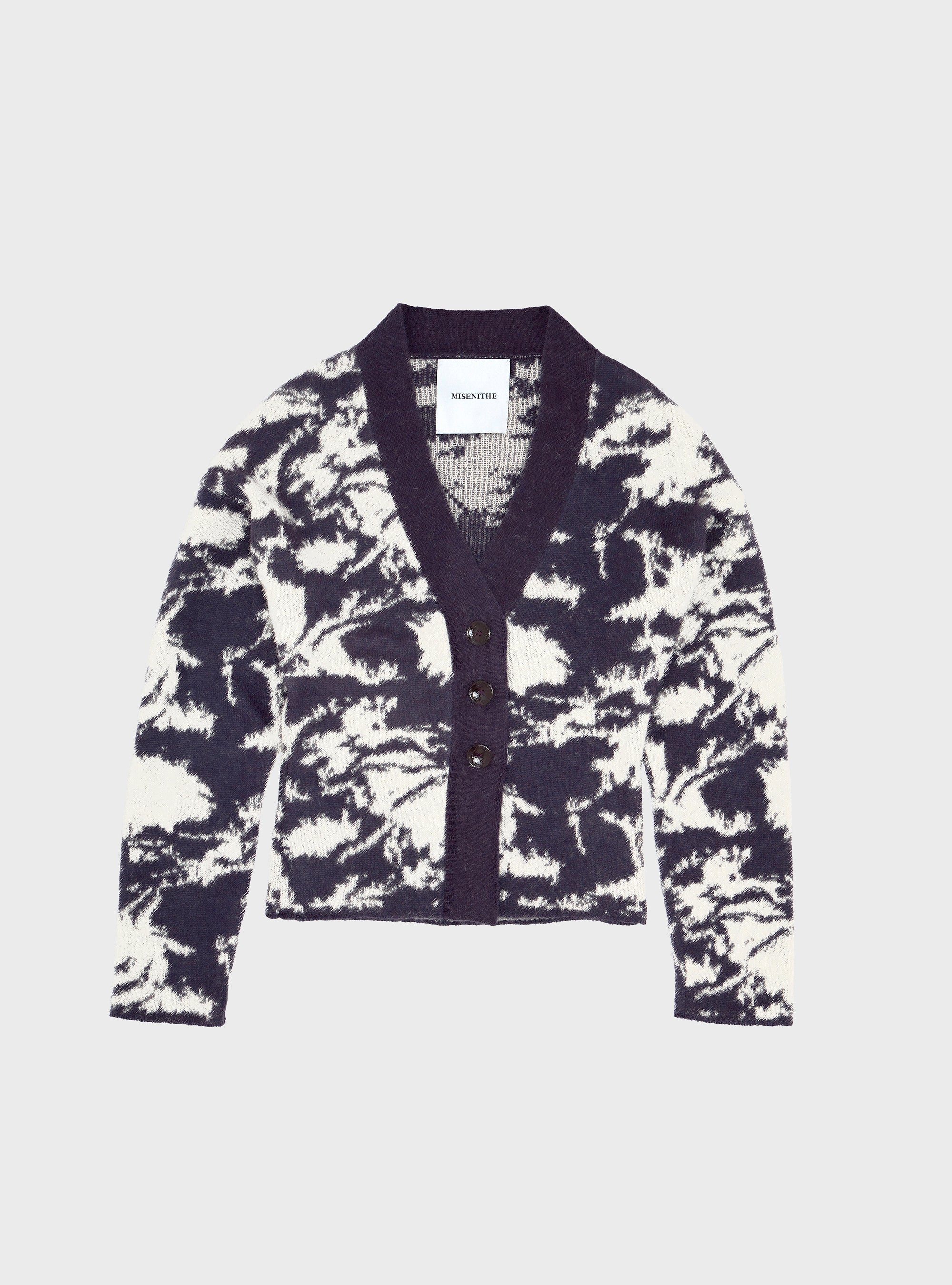 Cardigan con motivo jacquard floreale, in misto kid mohair. Chiusura asimmetrica con bottoni. Spalla scesa. Lista in costina 2x1. Orli rimagliati. Salpa in pelle sul centro dietro del collo. Il misto kid mohair, spazzolato, dona ulteriore morbidezza al capo.
