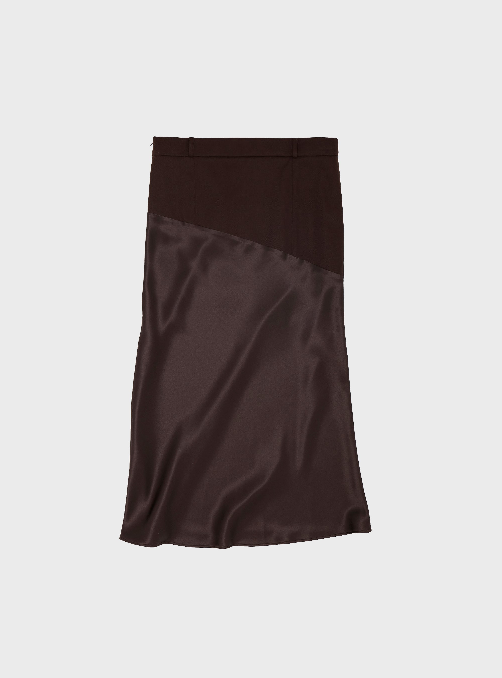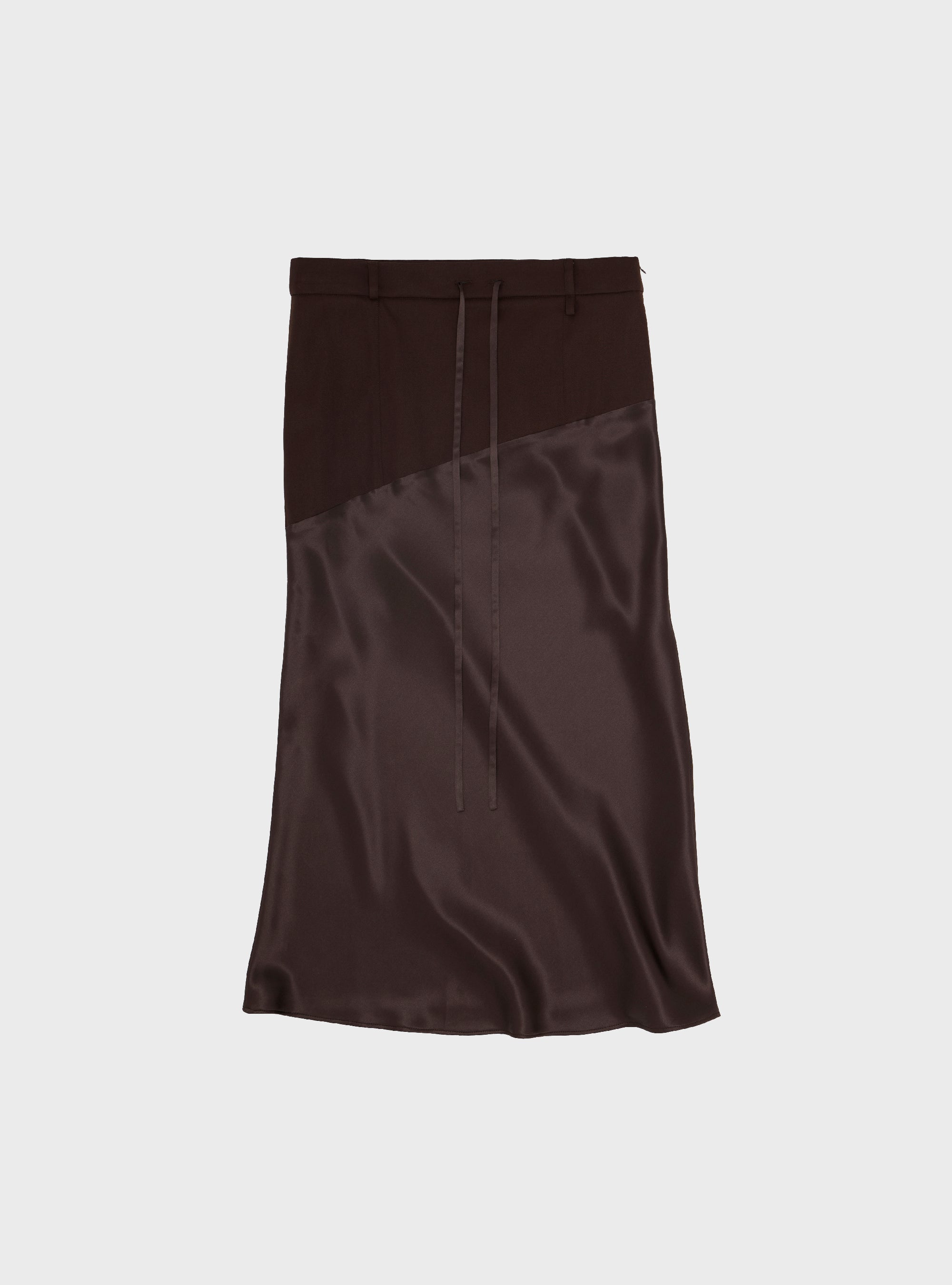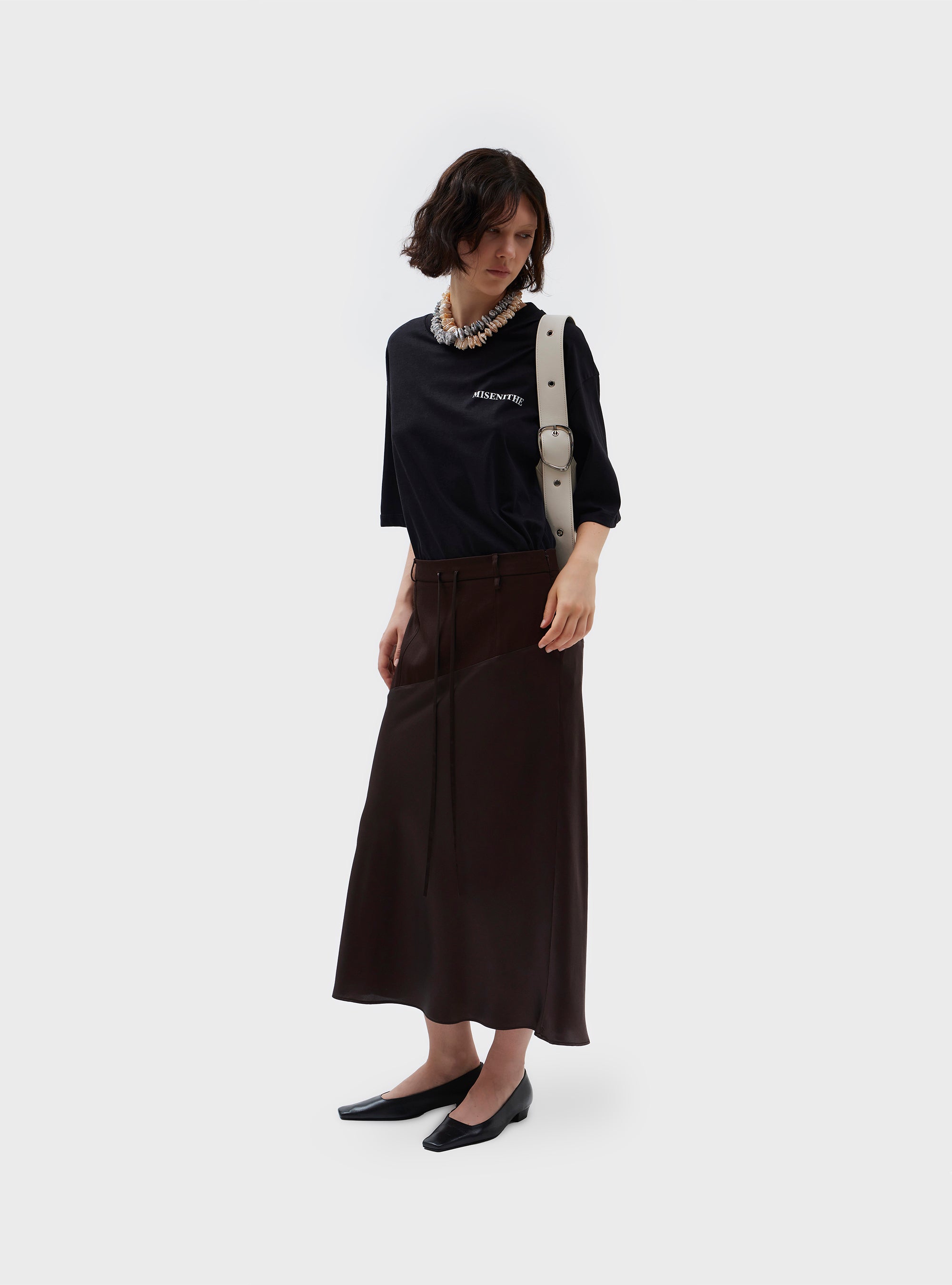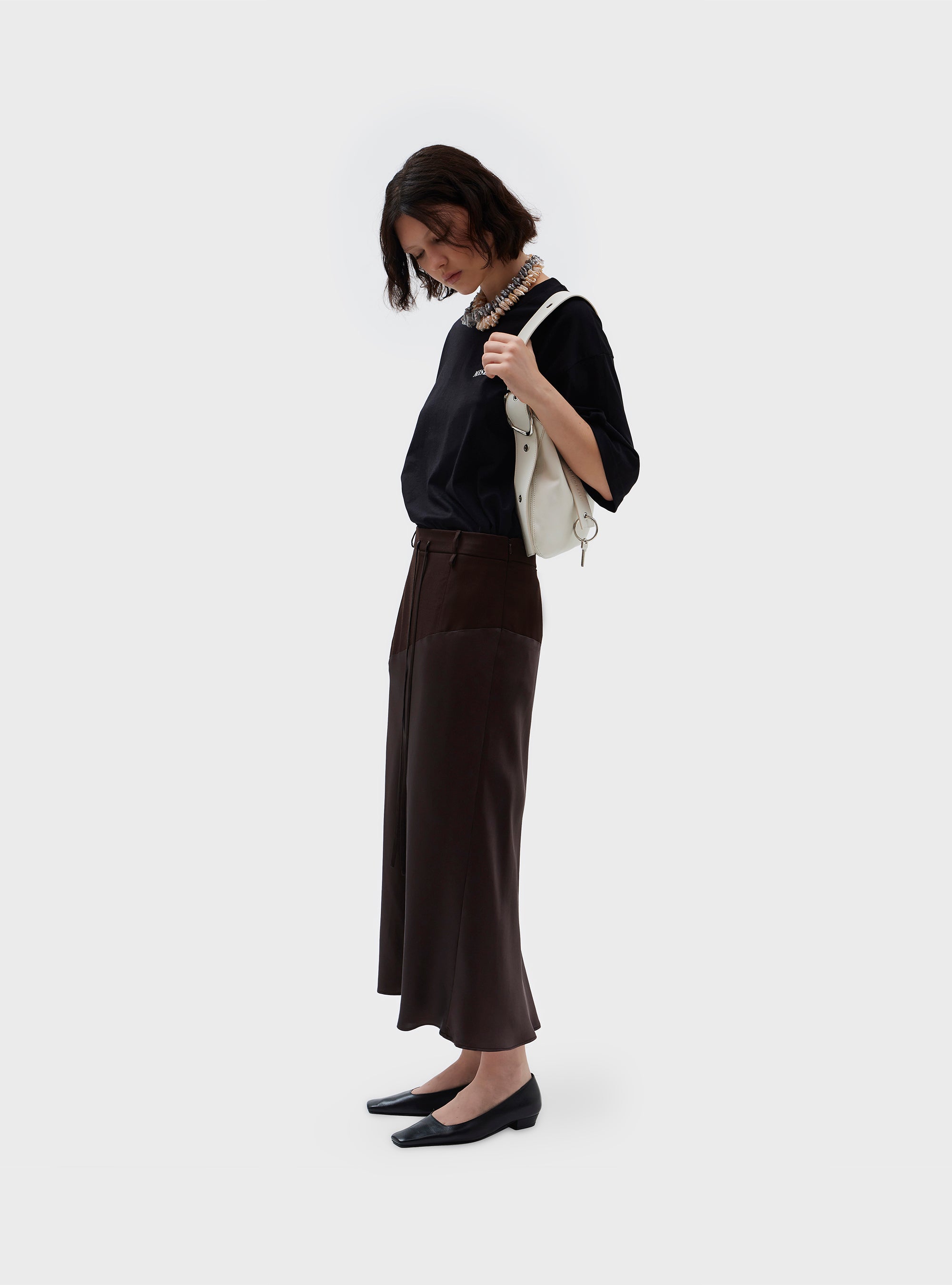 Gonna longette in doppio tessuto. Con baschina in puro fresco lana e gonna in pura seta. Tasche a filetto con bottone sul dietro, passanti e coulisse in vita. Zip invisibile laterale. Il fresco lana dona al capo una texture uniforme, morbida e leggera al tatto. La pura seta dona al capo una vestibilità fluida e una mano morbida.