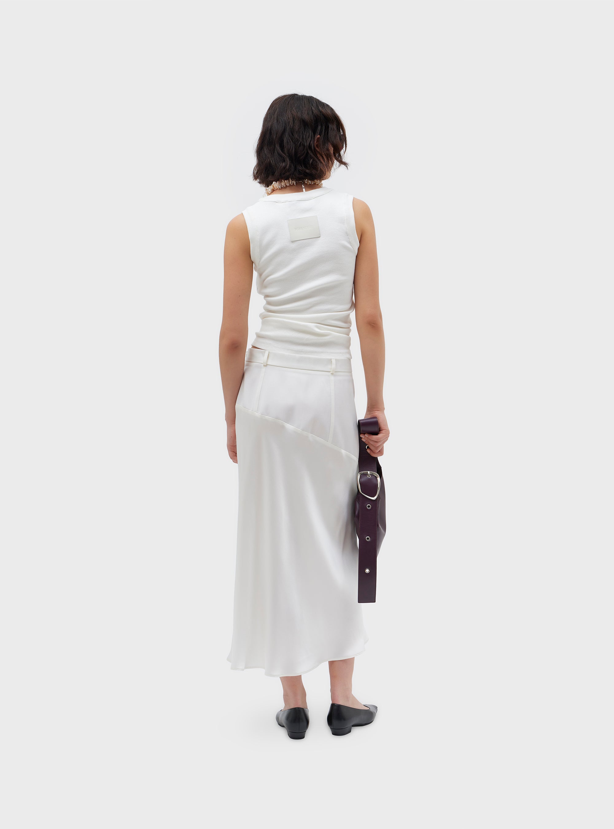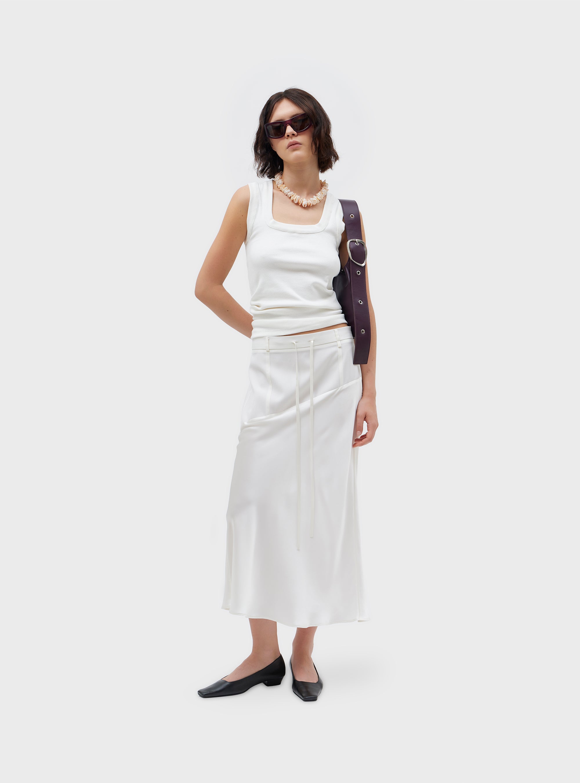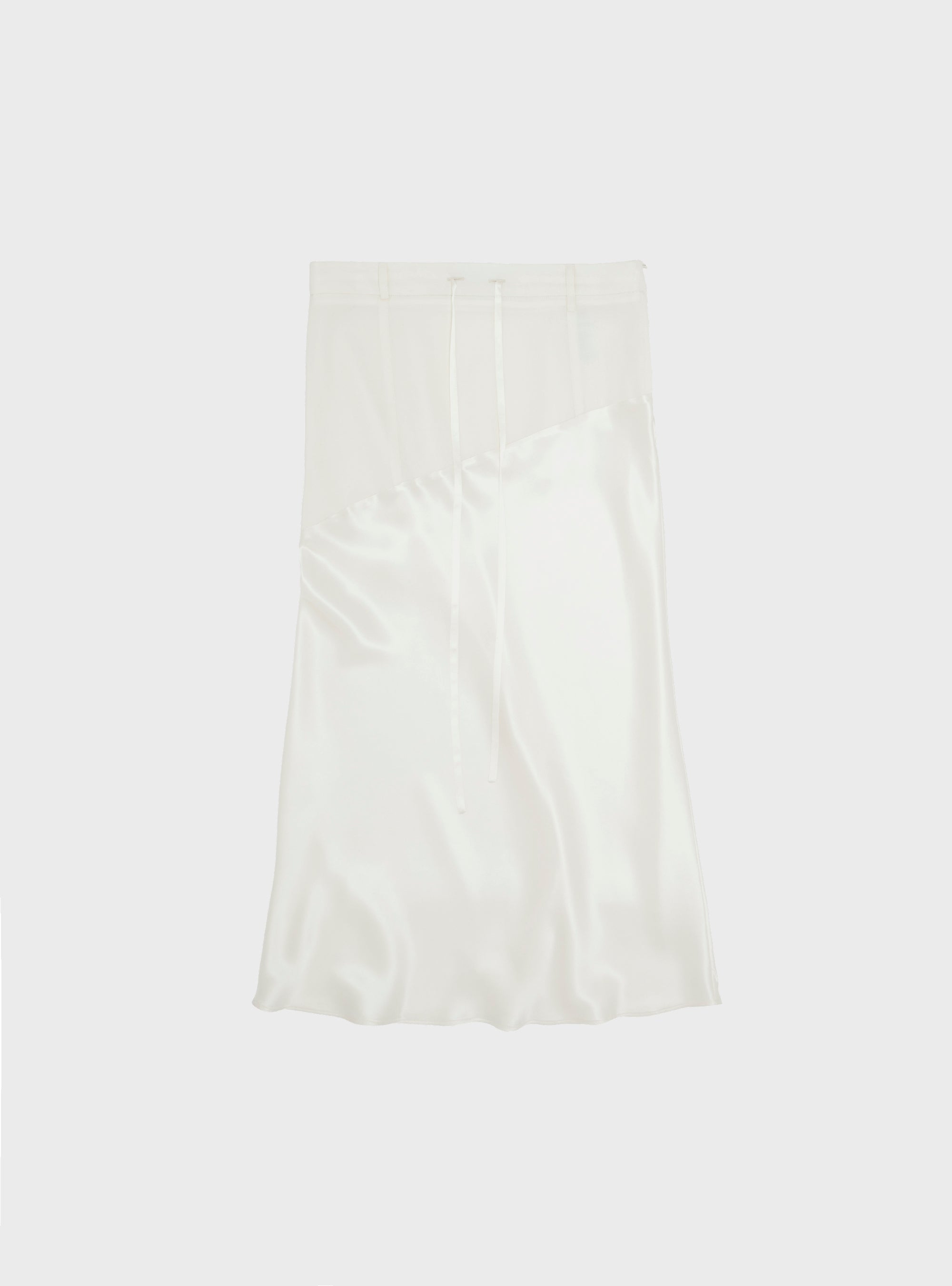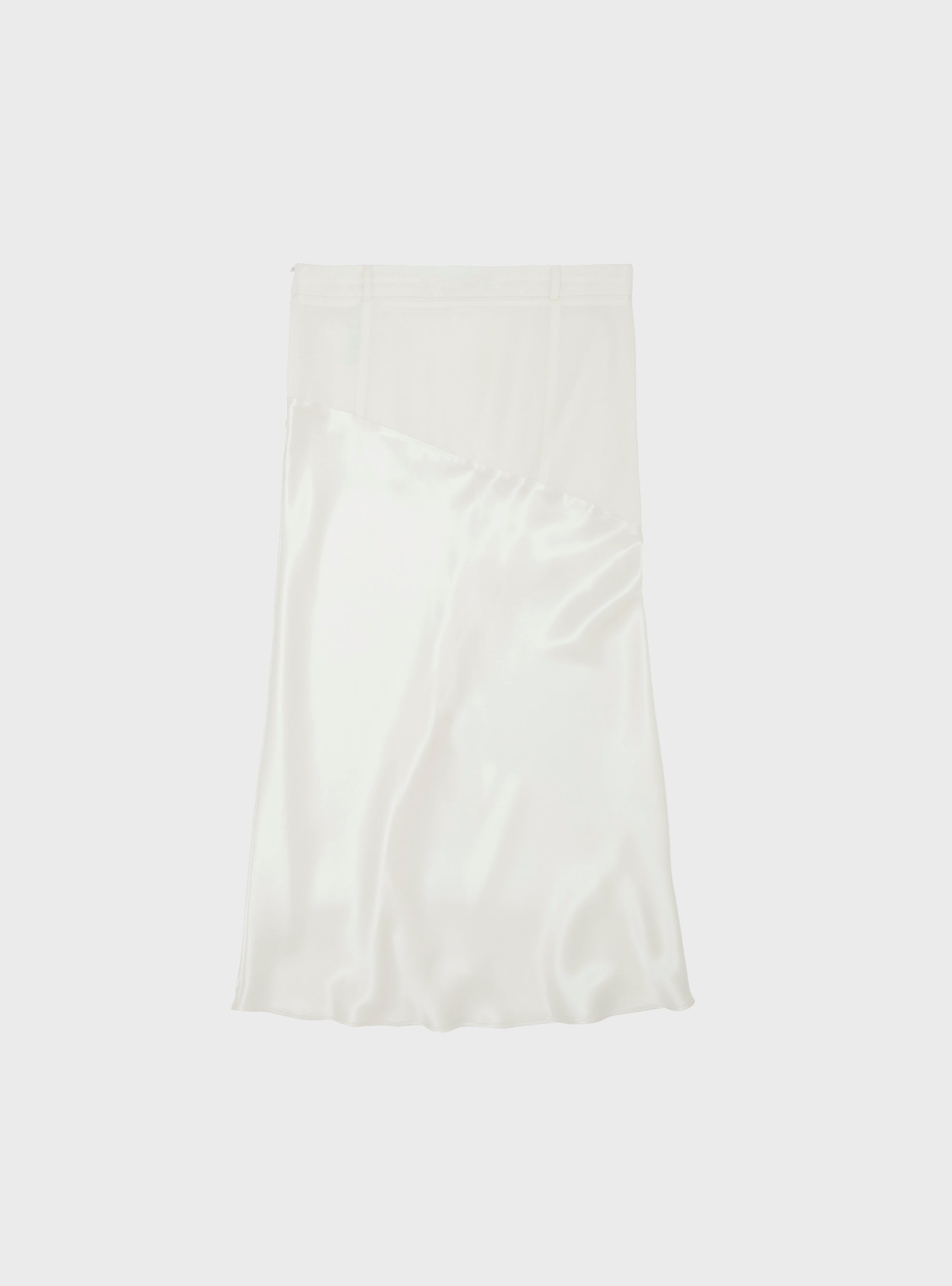 Gonna longette in doppio tessuto. Con baschina in puro fresco lana e gonna in pura seta. Tasche a filetto con bottone sul dietro, passanti e coulisse in vita. Zip invisibile laterale. Il fresco lana dona al capo una texture uniforme, morbida e leggera al tatto. La pura seta dona al capo una vestibilità fluida e una mano morbida.